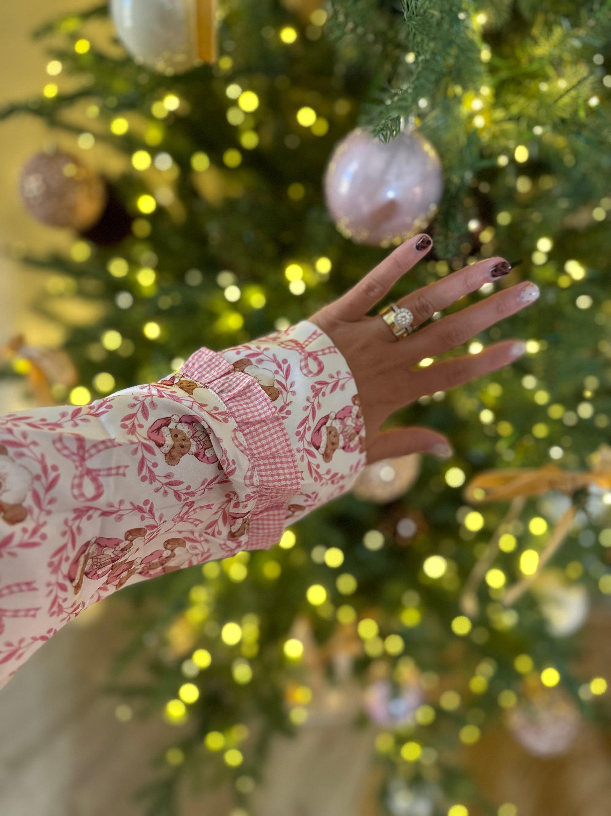 Satin feeling PJ set printed with bows and bears with Santa hats! Top has a slightly cropped fit, bottoms are high waisted. Top closure is by bows tying only, so may need a cami underneath if you don't like that closure. Ties functional. Pants have an elastic waist. If between sizes, size up.