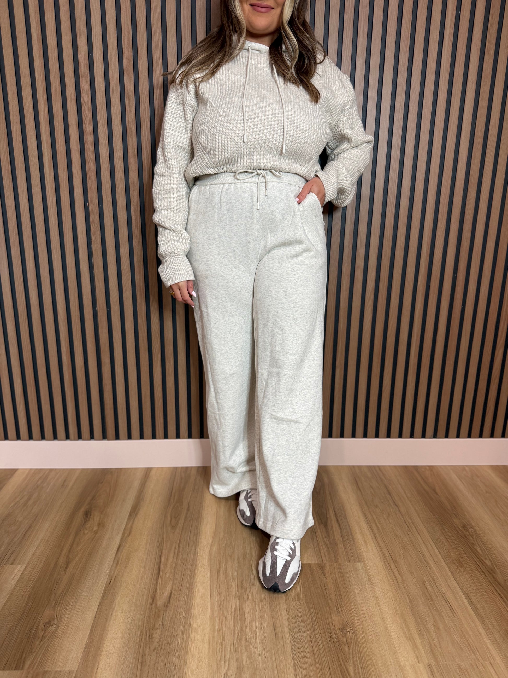 Two toned sweater/sweat material pant and sweatshirt set. Sweatshirt has a hood and a slightly cropped fit. I sized down to a medium!