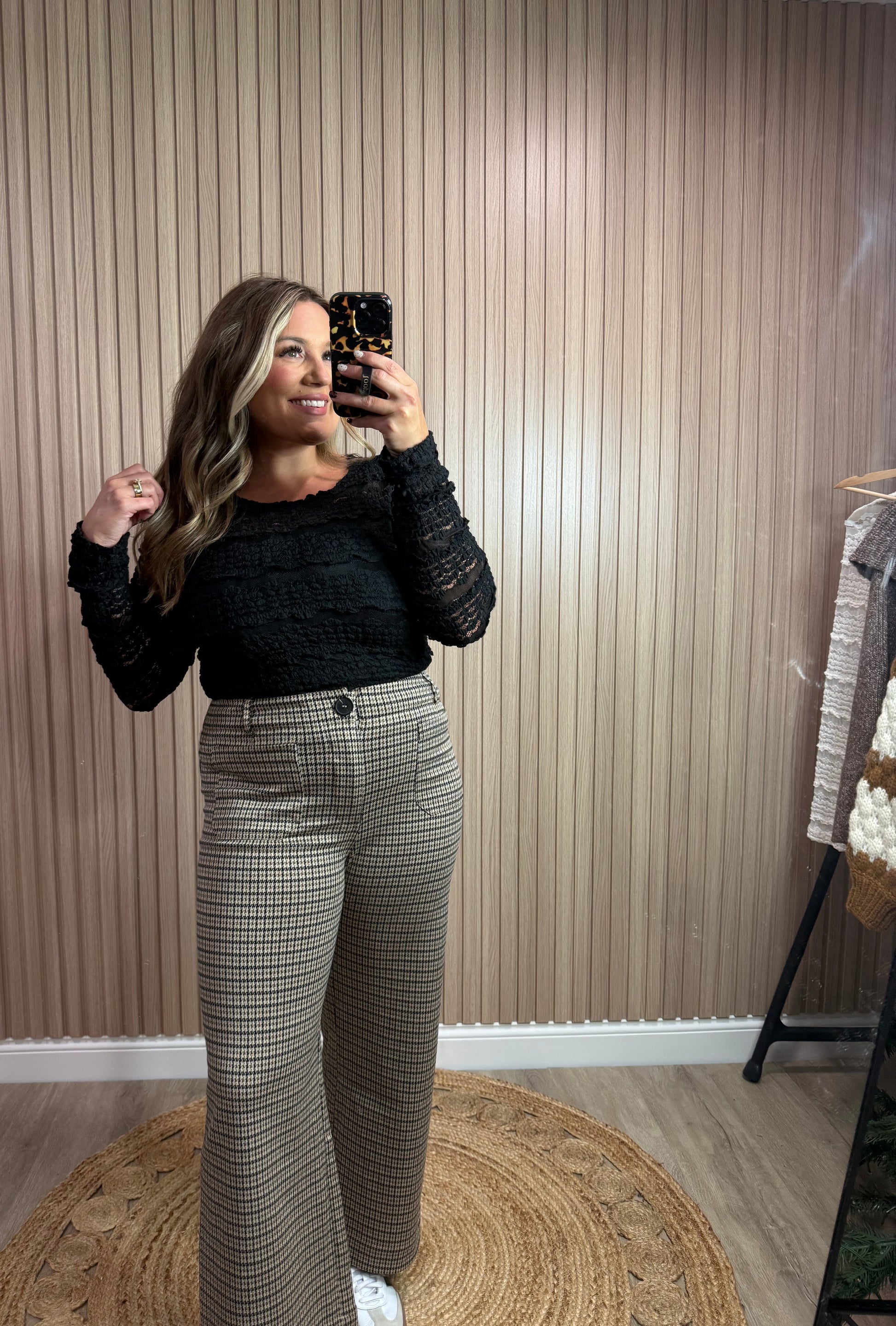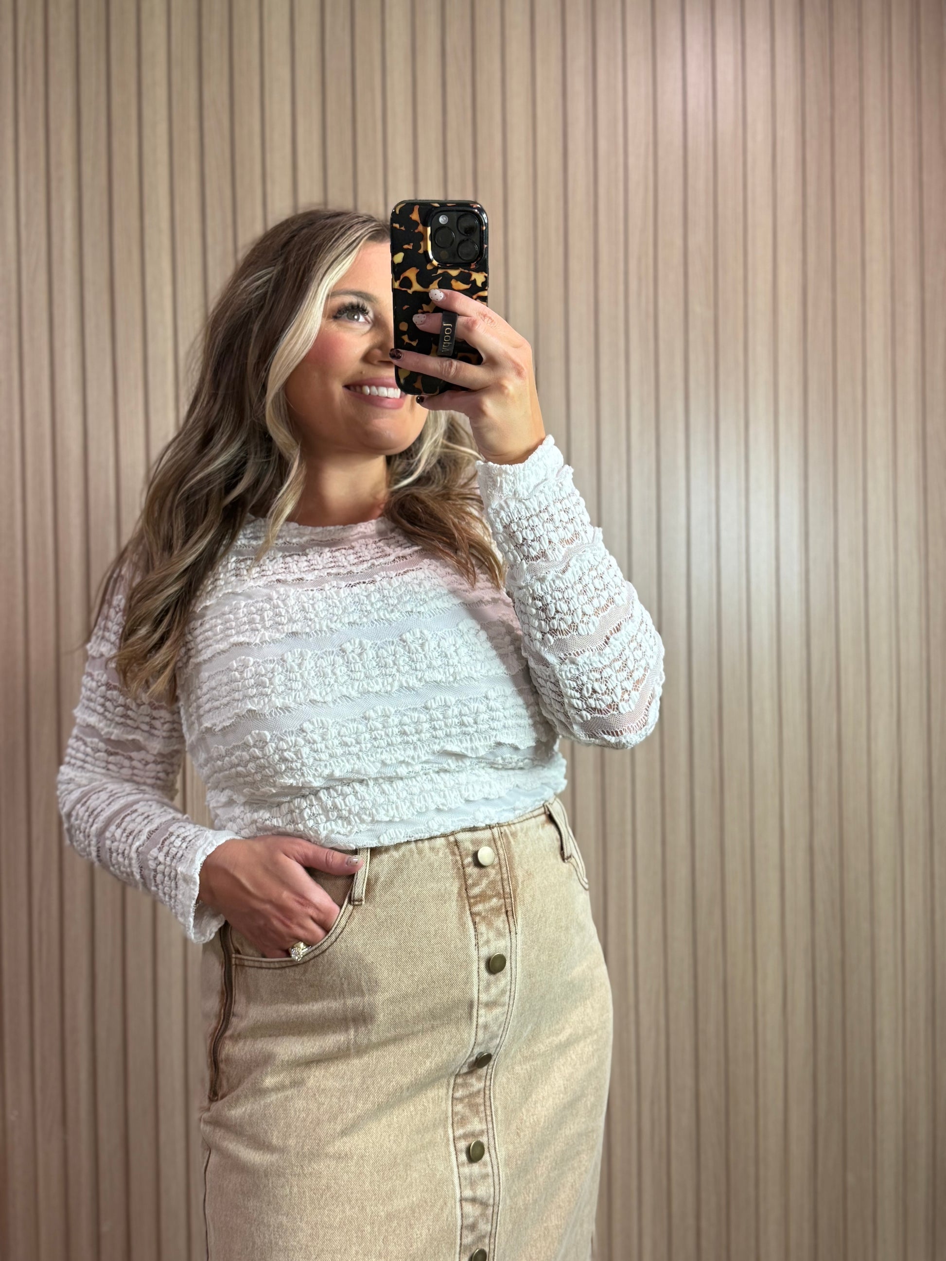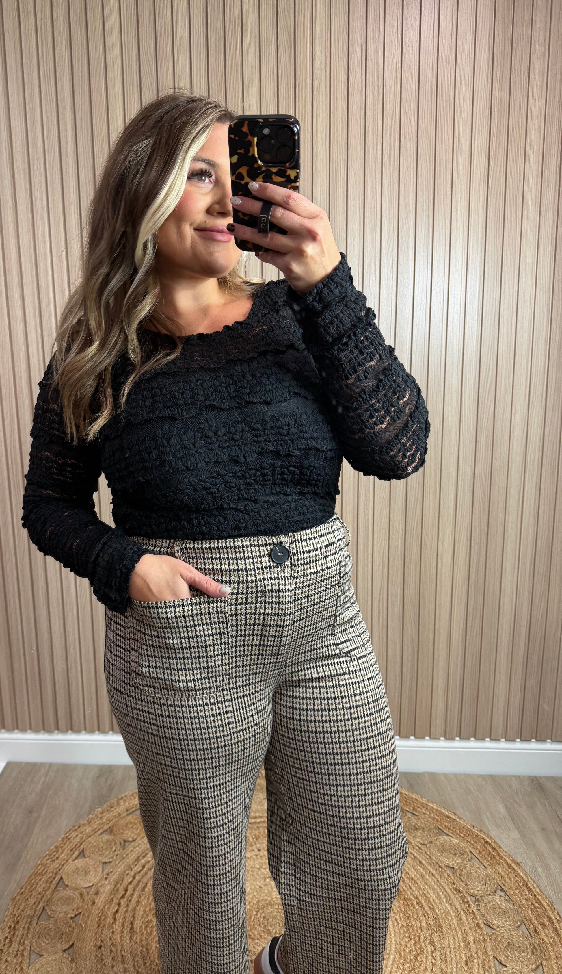 Lace layering long sleeve shirt with appliqué detail throughout. Runs true to size! Meant to be a layering tee. These are mesh and will need a shirt underneath.