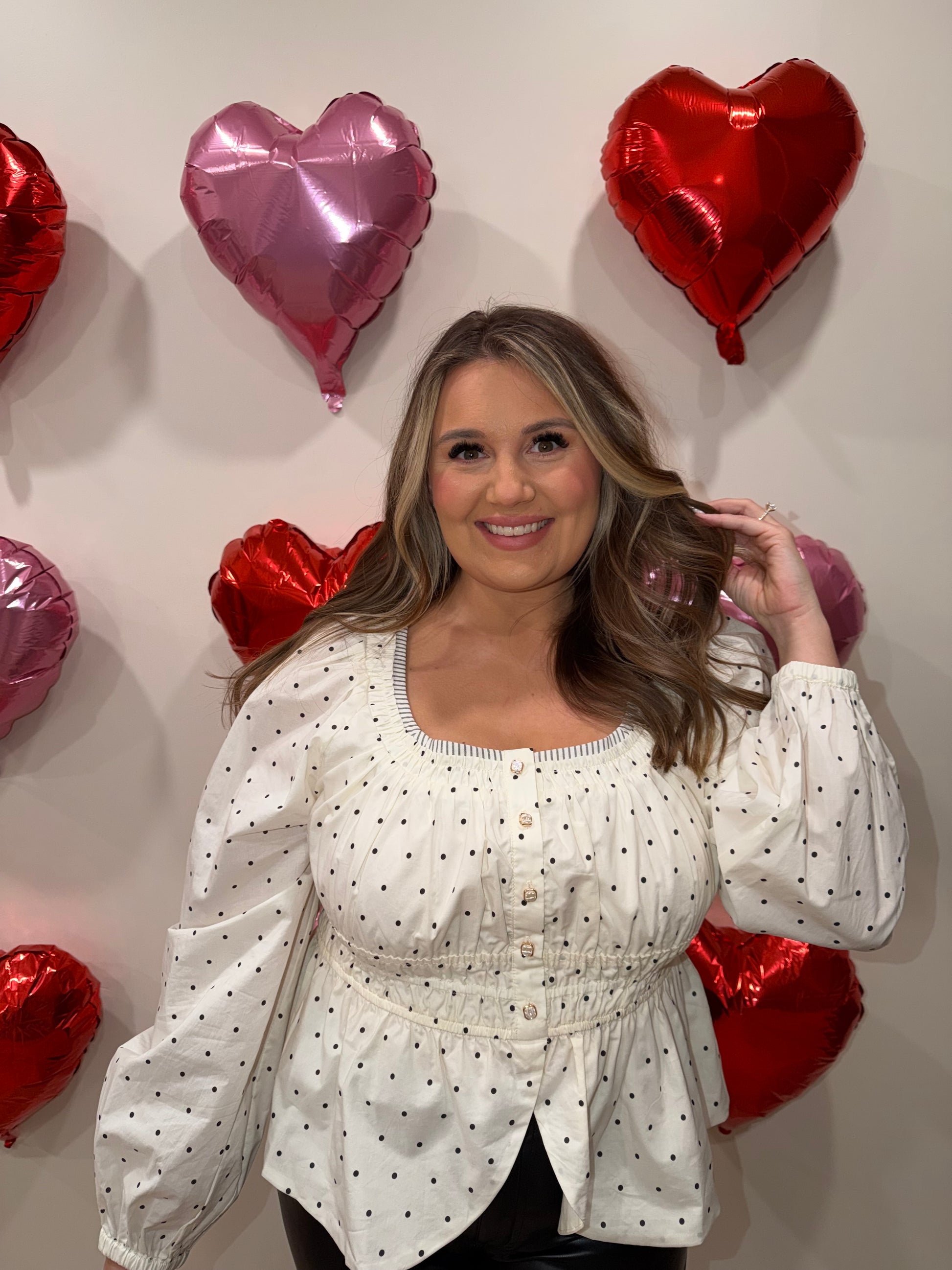 Polka dots are so in and this timeless style will never go out! Off white with black polka dots, elastic waist, and pearl gold trimmed (nonfunctional) button detail. No scoop neckline is trimmed in a subtle ruffle. Features a split hem at bottom hem. If between sizes, I would size down. I am wearing a large. 100% cotton.