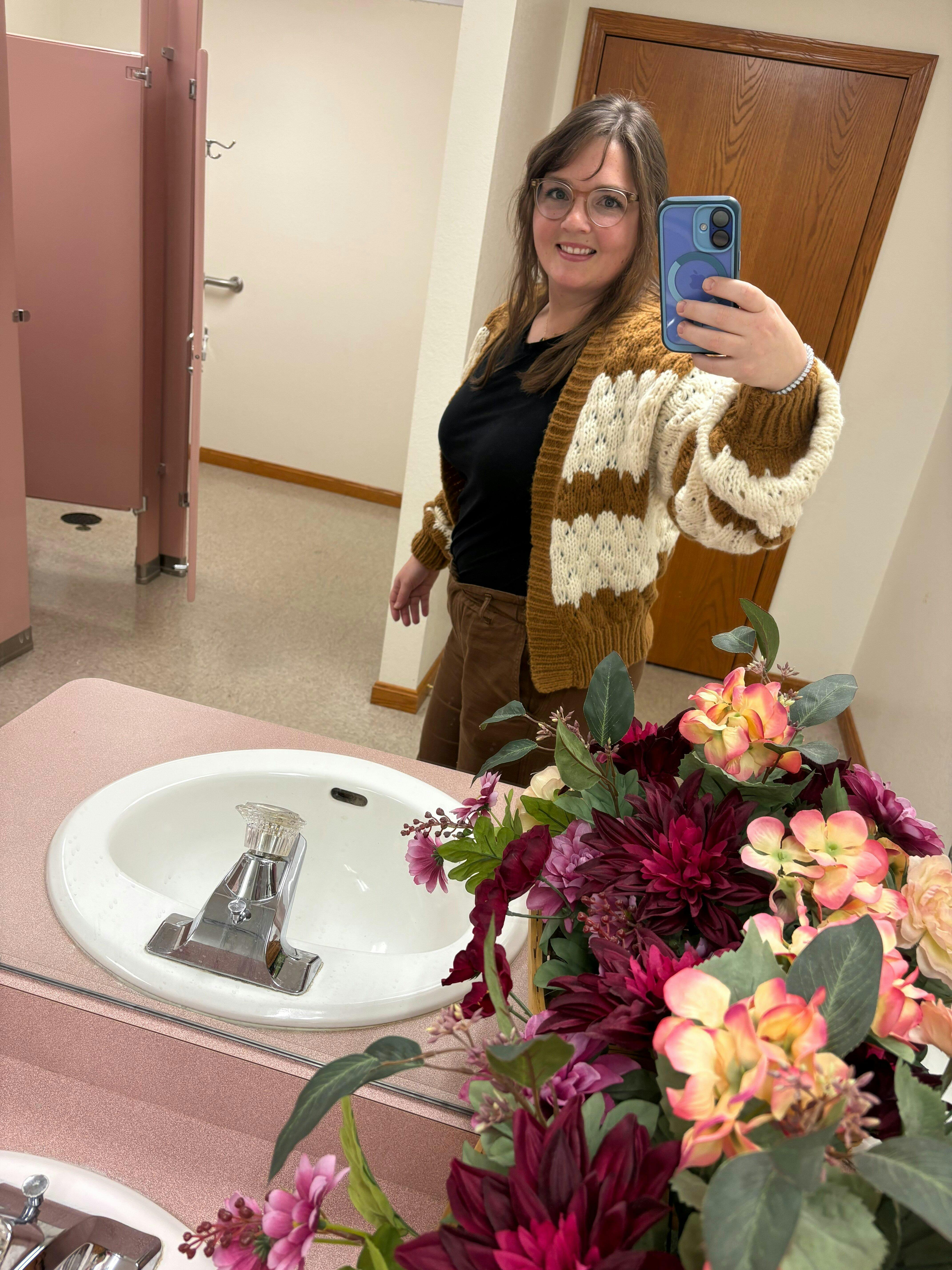 Knit scalloped stripe cardigan in rust/orange and cream. Runs true to size, Delaney is in a large.